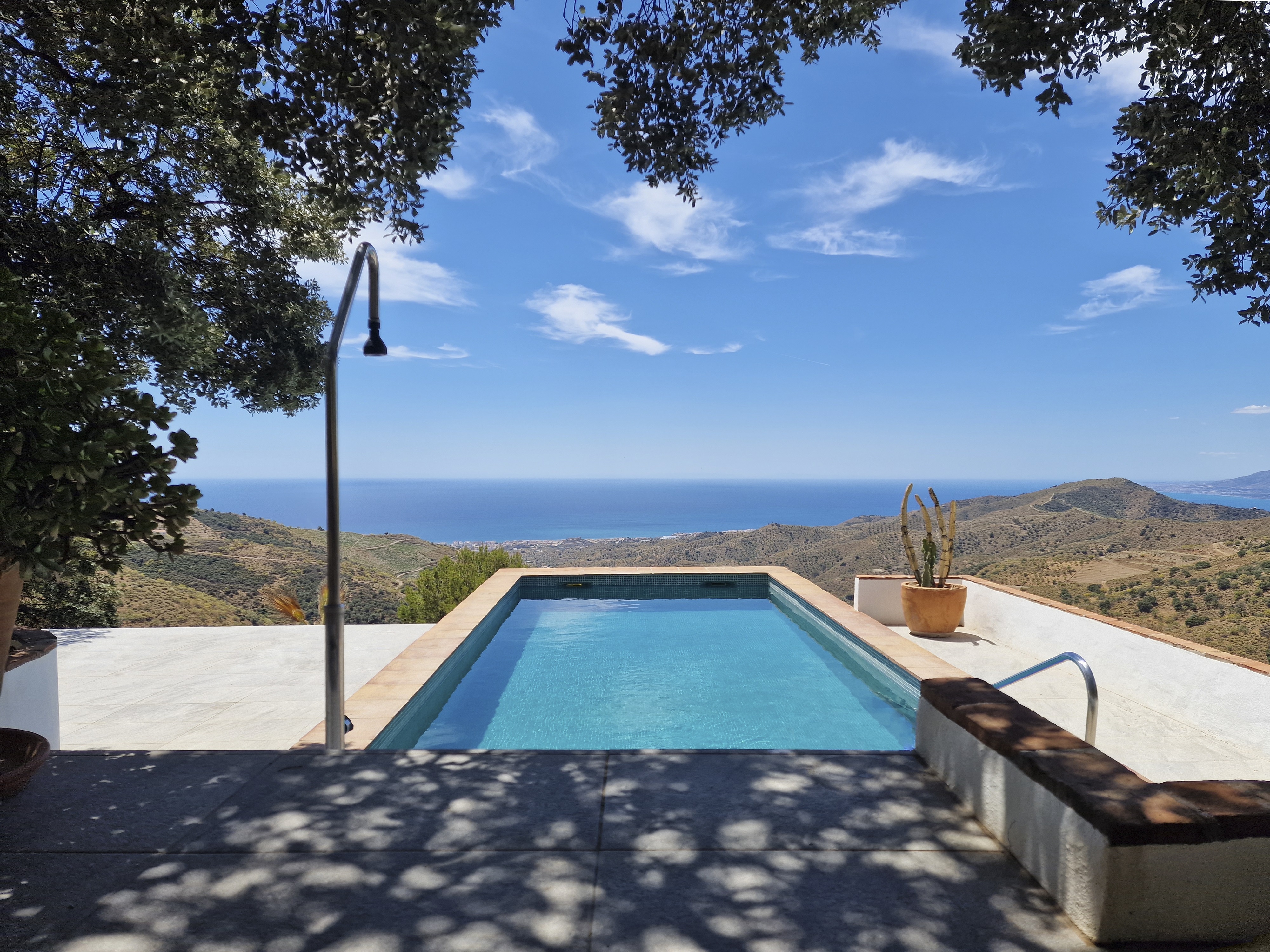 De moderne villa is omgeven door terrassen en een boomgaard met olijven. Rond het huis staat een aantal steeneiken, waardoor je overal heerlijk in de schaduw kunt zitten. Het uitzicht vanuit de villa op de Middellandse Zee is adembenemend. Bij helder weer zie je zelfs Gibraltar en het Afrikaanse continent. Door een vrijwel onbebouwd dal kijk je uit op de kustplaats Rincón de la Victoria waar ook de dichtstbijzijnde stranden te vinden zijn. In westelijke richting zie je de stad Málaga liggen.